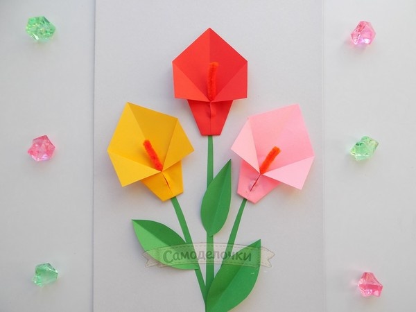 Для изготовления детских аппликаций чаще всего используется бумага. Мы предлагаем добавить к ней немного синельной проволоки и сделать красивые цветы. А при создании самих цветочком ребёнка можно познакомить с основами техники оригами. Весь процесс изготовления такой аппликации приведен в данном мастер-классе. Для создания такой поделки мы приготовили: