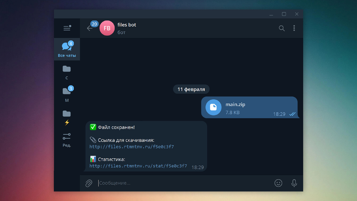 Всё построено на связке Telegram Bot API и простого веб‑сервера внутри одной программы. Пользователь отправляет боту файл как документ. Бот генерирует короткий уникальный идентификатор, сохраняет файл в папку "data" на сервере и заносит запись в SQLite‑базу. В ответ приходит прямая ссылка вроде "http://files.rtmntnv.ru/abc12345" (если к серверу не привязано доменное имя ссылка будет такого вида "http://ip-адрес-сервера/abc12345").
