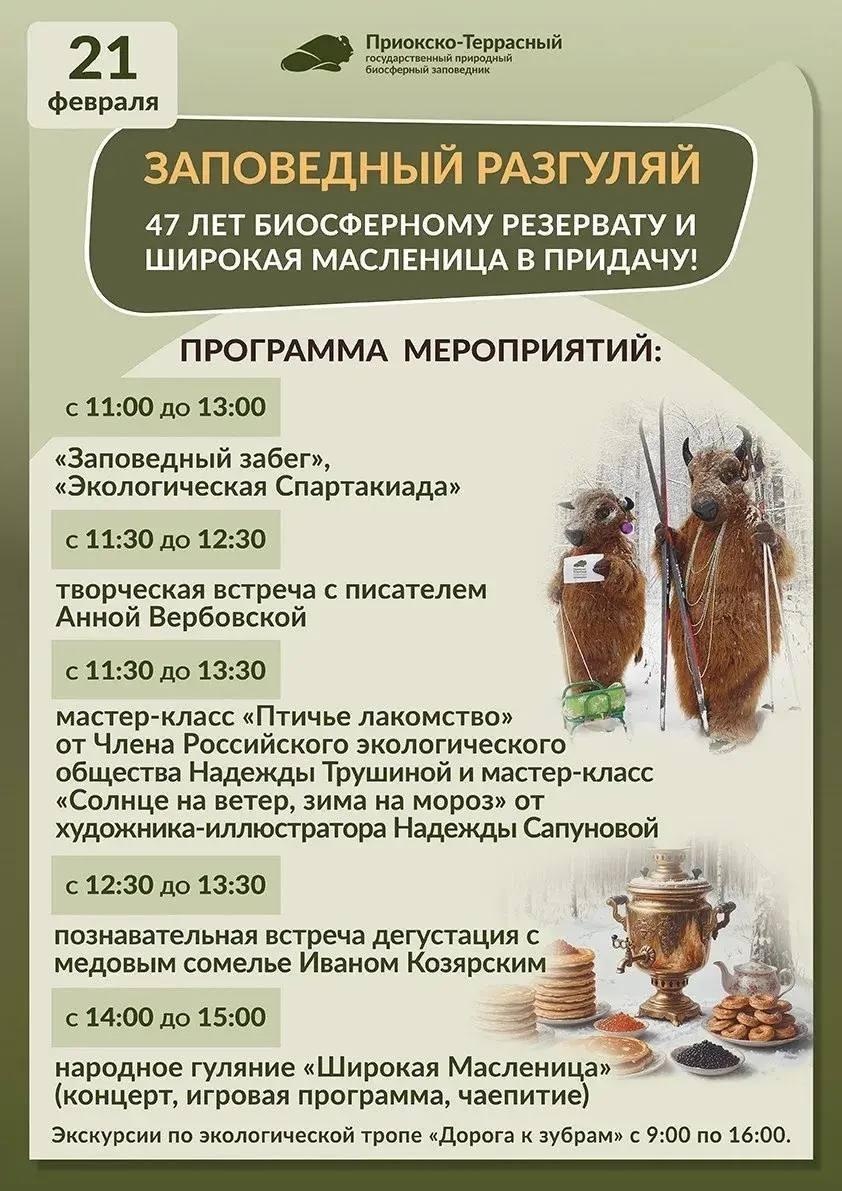 21 февраля Приокско-Террасный заповедник приглашает гостей на масштабный праздник «Заповедный разгуляй». Мероприятие приурочено сразу к двум событиям — широкой Масленице и 47-й годовщине присвоения заповеднику статуса Биосферного резервата. В программе — уличные гуляния с традиционными играми и чаепитием, экологический квест, мастер-классы и спортивный «Заповедный забег». Для гостей также пройдут творческая встреча с писательницей Анной Вербовской и дегустация с медовым сомелье. Начало праздника в 11:00. 👉 Подписаться | Прислать новость | Чат