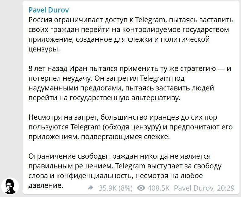 «Граждан России пытаются загнать в «контролируемое государством приложение, созданное для слежки и политической цензуры»», написал глава Telegram.