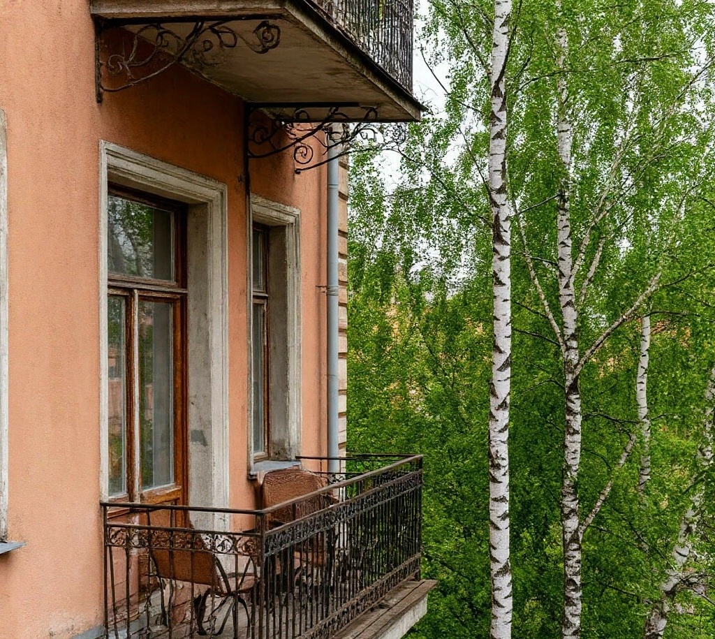 Ванна с туалетом только раздельно. А ещё здесь был просто потрясающий уютный балкон с видом на берёзовую рощу.