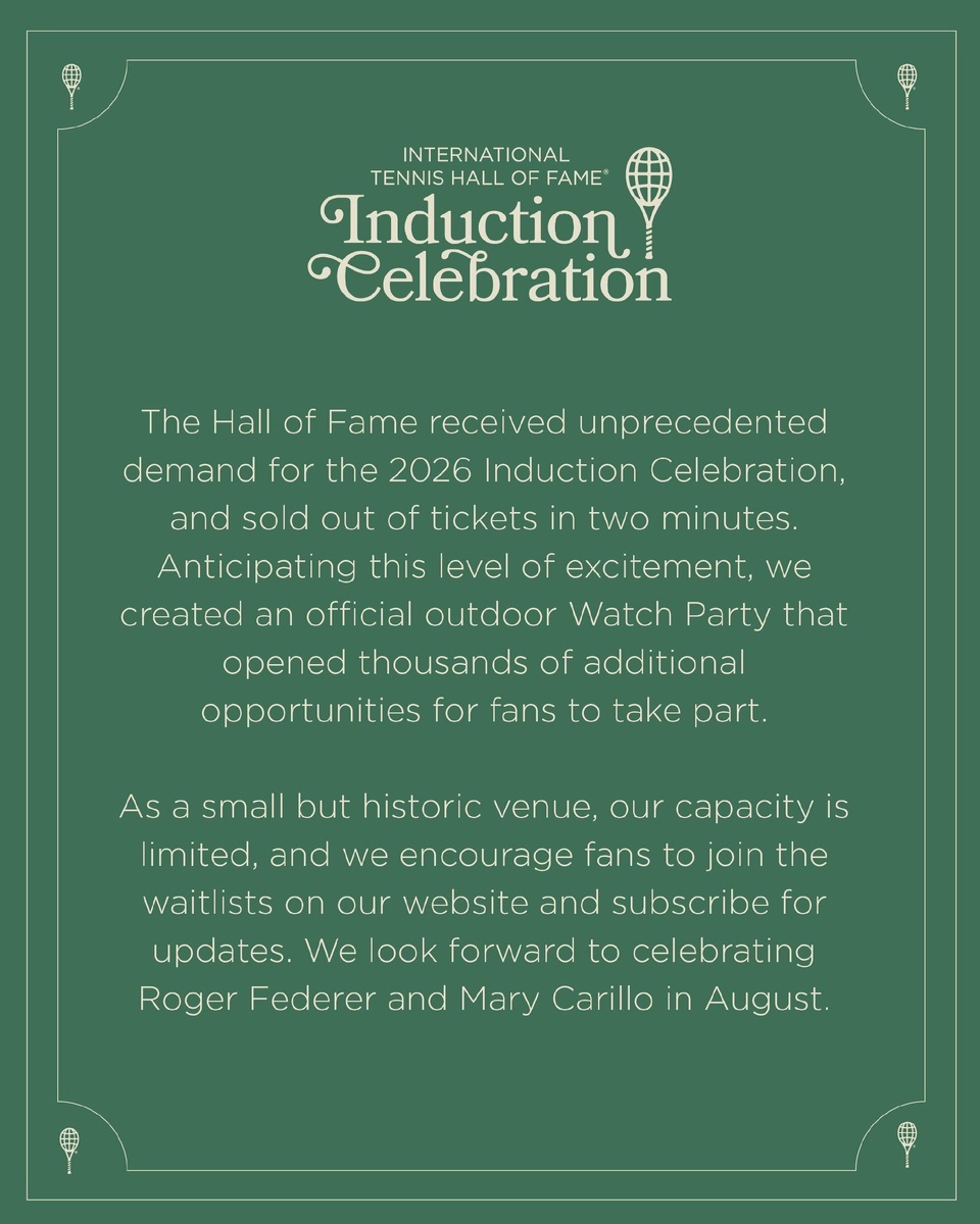 ! В связи с беспрецедентным спросом, был организован официальный просмотр на открытом воздухе, чтобы дать возможность большему количеству фанатов принять участие. Вместимость небольшая, но историческая, поэтому количество мест ограничено. Приглашаем фанатов присоединиться к спискам ожидания на нашем сайте и подписаться на обновления. С нетерпением ждем чествования Роджера Федерера и Мэри Карилло в августе. Подпишись на Эйс и точка