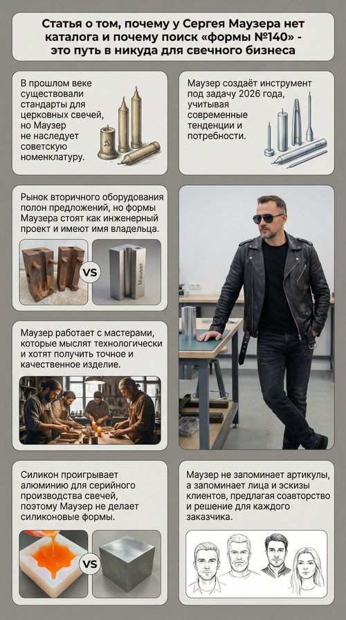 Маузер консультирует. Он расскажет, при какой температуре лить, какой фитиль ставить, как охлаждать. Он несет ответственность за результат, даже когда форма уже упакована и отправлена.