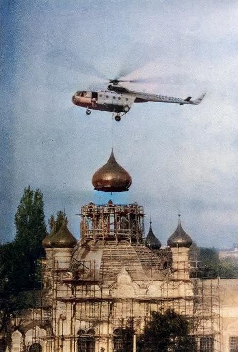 Вертолет группы аэропорта "Заводское" устанавливает купола в рамках работ по восстановлению храма.