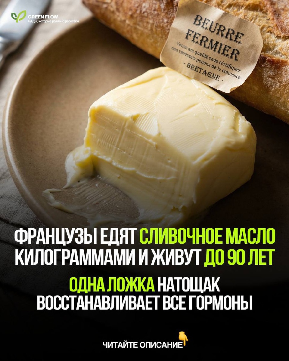 ! Французы съедают 8 кг сливочного масла в год на человека и имеют один из самых низких уровней сердечных заболеваний в Европе. Так в чём секрет 🤫? Сливочное масло – это строительный материал для всех половых гормонов. Без насыщенных жиров организм не может производить тестостерон, эстроген и гормоны щитовидки 80% женщин на обезжиренных диетах страдают от гормональных сбоев, нерегулярного цикла и проблем с весом. А одна ложка качественного масла утром запускает всю эндокринную систему 🧈 Главное – выбирать масло от коров на травяном откорме, а не промышленное 🐄 Нам есть чему поучиться у французов 🇫🇷 GREENFLOW.LIFE