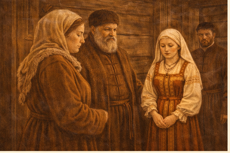 Вступление После свадьбы жизнь не начиналась заново — она резко менялась. В середине XVII века брак означал не просто переход в другой дом, а полную смену статуса, обязанностей и места в обществе. Девушка становилась молодой женой. И это было не романтическое звание, а новая роль с чётко определёнными рамками. Из дочери — в невестку Самым ощутимым изменением было подчинение новому дому. Молодая жена переставала быть дочерью в родительской семье и становилась невесткой в семье мужа. Это означало: Её положение было ниже старших женщин, но выше детей. Она занимала промежуточное, уязвимое место. Изменение внешнего облика Смена статуса отражалась и во внешнем виде. Девичий головной убор заменялся на замужний. Волосы скрывались, одежда становилась более закрытой. Покрытая голова символизировала: Эта перемена была заметна всем — общество видело, что статус изменился. Хозяйственные обязанности От молодой жены ожидали: Её труд становился частью общего благополучия семьи. Ошибки или неумение мог