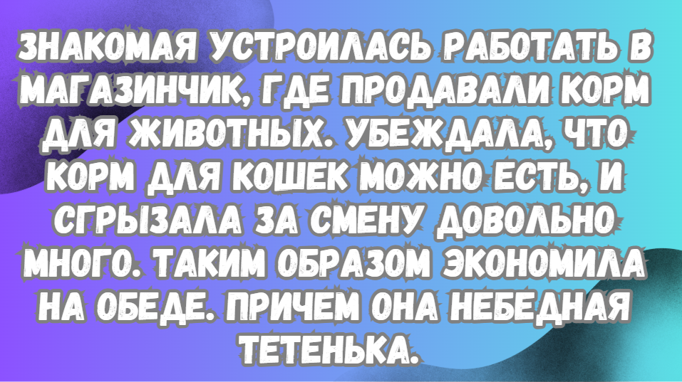 - Знакомая устроилась работать в магазинчик, где продавали корм для животных. Убеждала, что корм для кошек можно есть, и сгрызала за смену довольно много. Таким образом экономила на обеде. Причем она небедная тетенька. © Ольга Мариуц / ADME