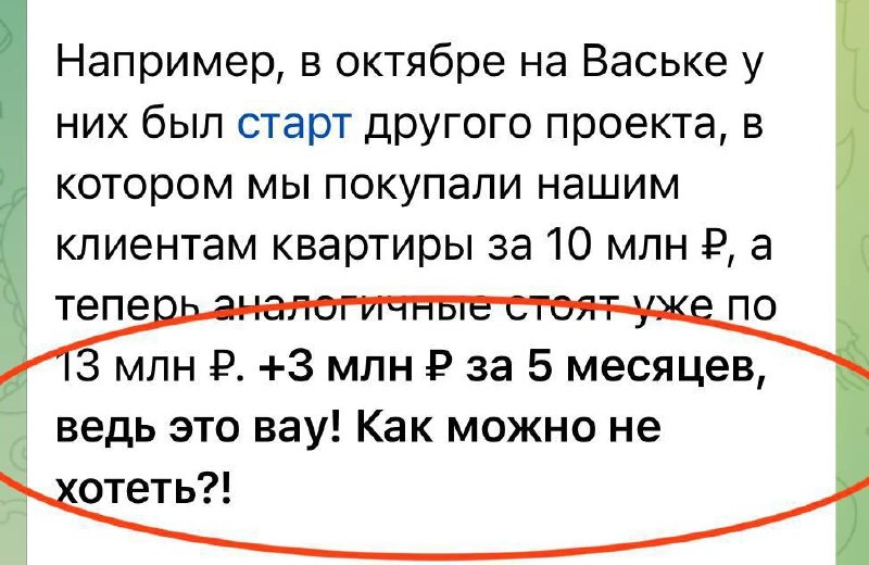 ». Я подписан на многие каналы коллег: агентства, риэлторы, застройщики. Какие-то каналы мне нравятся, какие-то — не очень. Но сейчас не об этом. Почему решил написать этот пост именно сейчас. В ближайшее время в Петербурге будет новый старт продаж у действительно хорошего застройщика. Проект — нормальный, локация — адекватная, спрос точно будет. И вот как продавать такие старты точно не нужно, я вам сейчас покажу. Недавно снова наткнулся на знакомый приём. «Цена на объект выросла на 3 млн рублей» И здесь важный момент. Да, я сам считаю, что со временем будет дороже, и на стартах продаж цена действительно растёт. Это нормально и логично для рынка. Но проблема не в росте как таковом, а в том, как его подают. Когда вам говорят, что «цена выросла на 3 млн», создаётся ощущение, что вы уже завтра сможете зафиксировать эту прибавку. А это не так. Давайте разберёмся, выросла ли цена на самом деле и что вообще происходит. Да, у застройщиков действительно бывают такие истории. Например,