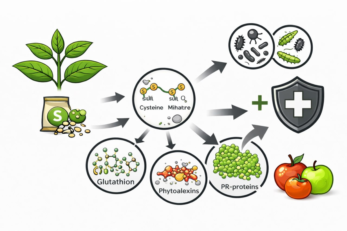 Серу часто воспринимают как «дополнение» к азоту - элемент, влияющий на белковый синтез и качество урожая. Но с физиологической точки зрения сера - это один из базовых элементов иммунной системы растения. В прямом смысле слова: без неё защитные белки просто не синтезируются. Сера входит в состав аминокислот цистеина и метионина. А цистеин - ключевой компонент многих ферментов и регуляторных белков, участвующих в ответе на стресс и инфекцию. Через эти соединения сера становится фундаментом целого каскада защитных реакций. При достаточном обеспечении S активнее синтезируются: Глутатион - центральный антиоксидант клетки, участвующий в детоксикации активных форм кислорода и регуляции сигнальных путей иммунитета. Фитоалексины - антимикробные соединения, которые растение синтезирует в ответ на заражение. PR-белки (pathogenesis-related proteins) - белки, непосредственно участвующие в подавлении роста патогенов. При дефиците серы эти механизмы ослабевают. Даже если азот обеспечен в полно