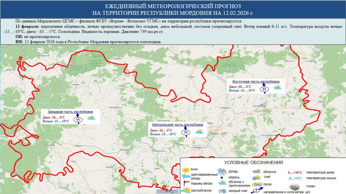 ☁️⛅⛈️ 12 февраля в Мордовии переменная облачность, ночью преимущественно без осадков, днем небольшой, местами умеренный снег гололедица