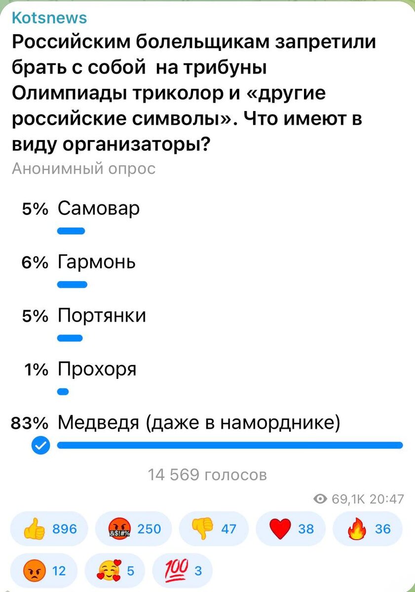 ⚡️⚡️⚡️ 83 процента подписчиков считают, что на трибуны можно привести медведя в наморднике. А если партнеры продолжат хамить, намордник можно будет снять.