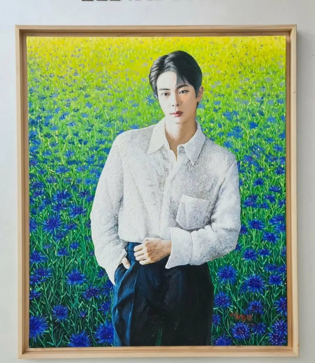 Работа, вдохновлённая участником BTS Джином, была представлена в выставочном пространстве и привлекла особое внимание посетителей. Картина, выполненная маслом, переосмысляет образ артиста через язык живописи, создавая лиричную сцену единения человека и природы. На полотне Джин предстает на фоне цветущих голубых полевых цветов. Зелёные поля и пурпурные оттенки, заполняющие всё пространство картины, выполнены выразительными мазками, придающими композиции глубину и динамику. Центральная фигура артиста излучает спокойствие и утончённость. Джин изображён в белой рубашке с мягким, сосредоточенным взглядом и сдержанным выражением лица, гармонично вписанным в окружающий пейзаж. Этот образ воспринимается как визуальная поэма, а портрет музыканта с мировым признанием рассматривается не просто как фан-арт, а как полноценное художественное произведение с собственной эстетической ценностью. Ким Ён-ми, автор портрета, занимается живописью в качестве творческого увлечения. Не имея формального худо