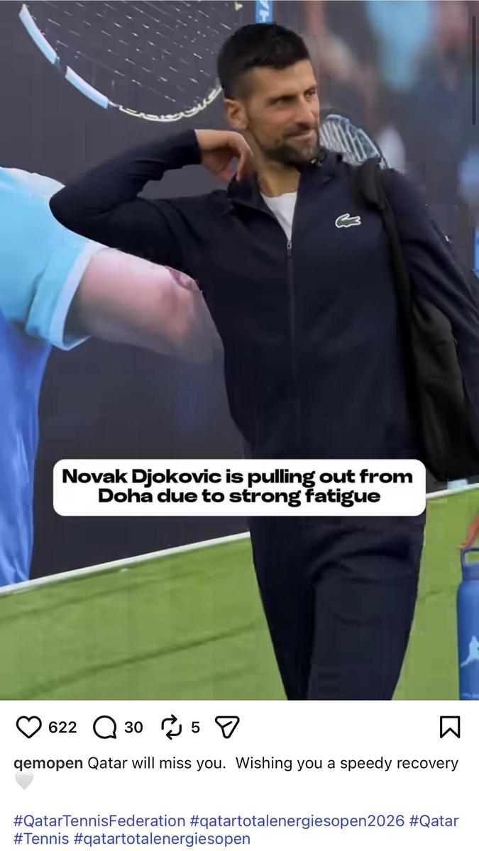 ⚡ Новак Джокович снялся с Qatar Open 2026 в Дохе из-за сильной усталости 🎾