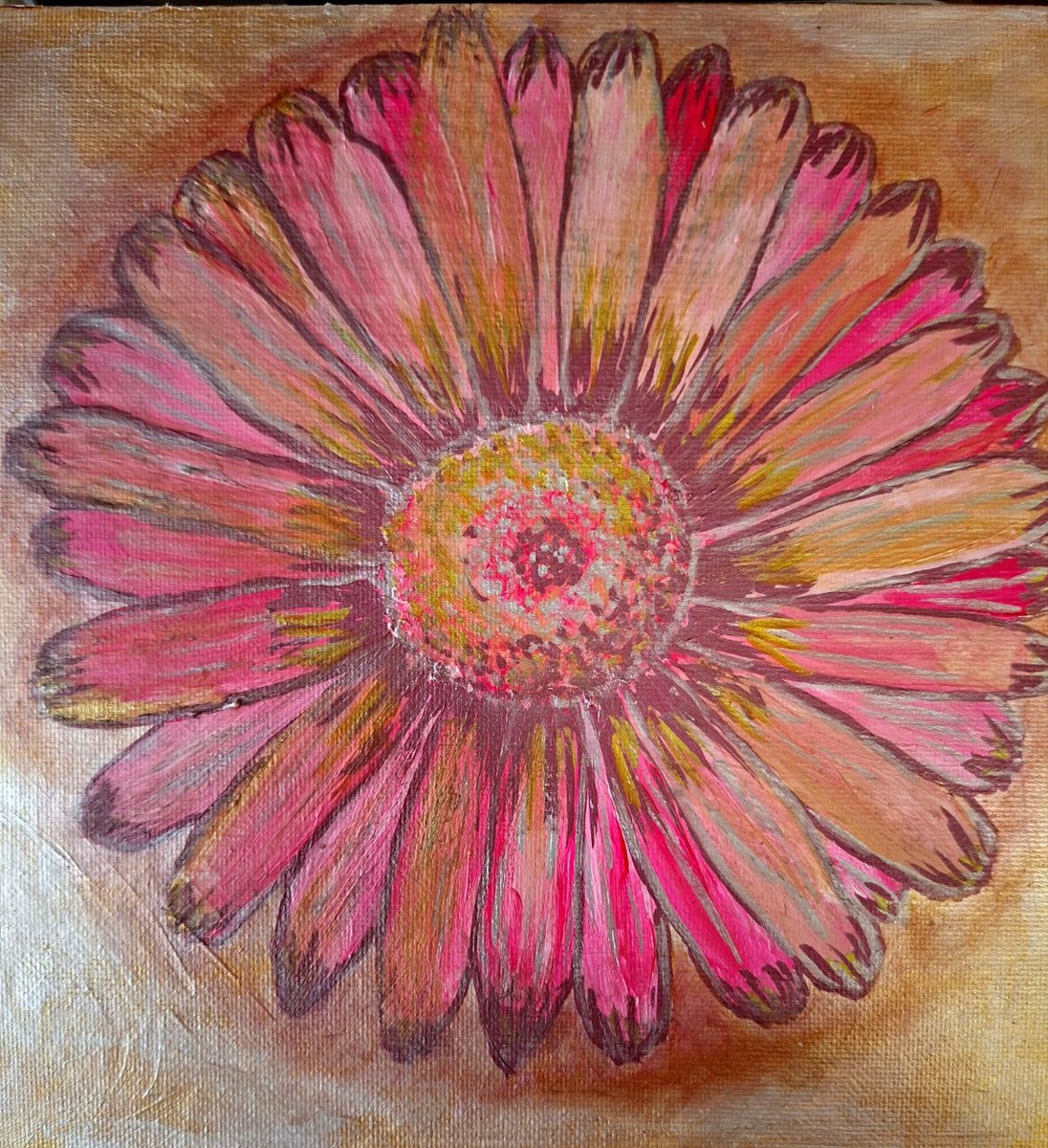 В этой работе цветок перестаёт быть «ромашкой» в привычном понимании. Он сохраняет форму, но меняет температуру. Белый уходит. На его месте — розовый, малиновый, тёплый персиковый. Это уже не наблюдение за цветком, а работа с состоянием через цвет. Композиция снова крупная, почти без стебля и без среды. Цветок занимает всё пространство. Он не вписан — он заполняет. Это усиливает ощущение присутствия. Сердцевина стала сложнее по оттенкам. В ней больше красного, больше движения. Она не плоская и не спокойная — она пульсирует. Центр здесь живёт активнее, чем лепестки. Контуры затемнены, местами подчёркнуты. Это добавляет графичности и удерживает форму, чтобы она не растворилась в яркости. Без этих линий работа была бы слишком мягкой.Фон тёплый, нейтральный. Он поддерживает цветок, но не конкурирует. Это сознательный шаг: после вертикальных полос предыдущей работы фон снова упрощается, чтобы внимание осталось в центре. Если смотреть на цикл целиком, это момент эмоционального усиления. Повт