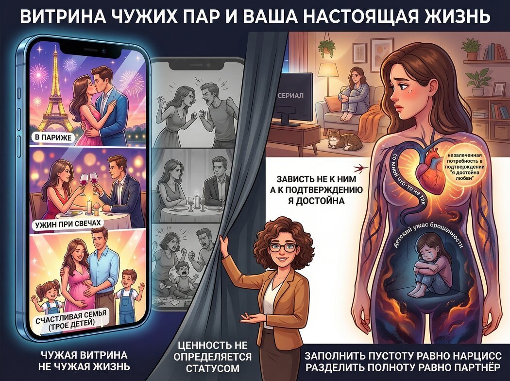Суббота. Лента полна фотографий: подруга с мужем в Париже, коллега с бойфрендом на ужине, бывшая одноклассница — беременна третьим. А вы в пижаме, с котом и сериалом, который уже пересматриваете второй раз. И вроде кот хороший, и сериал неплохой. Но внутри — тоненькая, ядовитая мысль: “Все нашли кого-то. А со мной что-то не так”. Самое обидное — вы знаете, что половина этих “счастливых пар” тихо ненавидят друг друга по вечерам. Но это знание почему-то не помогает. Чужое “хотя бы с кем-то” кажется лучше вашего “совсем одна”. Когда вы смотрите на чужие отношения и чувствуете укол — это не зависть к конкретным людям. Это тоска по внутреннему объекту, которого у вас нет. Мелани Кляйн описала депрессивную позицию — состояние, в котором мы способны горевать о том, чего не имеем, без разрушения себя. Но если в детстве вас не научили горевать (говорили “не ной”, “будь сильной”, “нечего жаловаться”), — вместо здоровой грусти вы чувствуете токсичный стыд: “Я недостаточно хороша, чтобы быть с ке