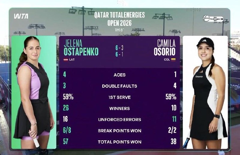 ⚡ Елена Остапенко обыграла Камилу Осорио в матче WTA 1000 в Дохе со счетом 6-3, 6-1 🎾