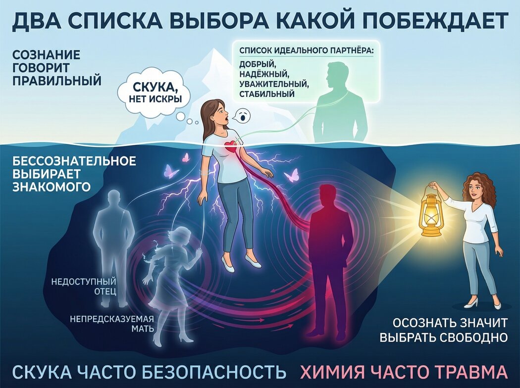 Вы знаете, каким должен быть “правильный” мужчина. Добрый, надёжный, с чувством юмора, стабильный. И вот вы встречаете его — ровно такого. Спокойный, предсказуемый, уважительный. И через месяц думаете: “Скучно. Нет искры”. А потом — бац — и вы снова с загадочным незнакомцем, который отвечает через сутки и смотрит так, будто вы единственная женщина на планете. Что произошло? Ваше бессознательное сделало выбор за вас. Пока сознание составляло список “хорошего мужчины”, глубинная часть психики выбрала по совсем другим критериям — по внутренним объектам. Мелани Кляйн — один из столпов психоанализа — описала механизм, который определяет наши отношения с первых месяцев жизни. Мы создаём внутренние образы значимых фигур (прежде всего матери и отца). Не реальных — а таких, какими мы их переживали. Эти образы становятся “шаблонами”, по которым мы бессознательно ищем партнёров. Если ваш внутренний образ любви — это недоступный отец, который иногда дарил внимание, — вы будете бессознательно выби