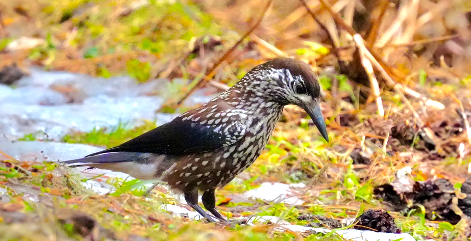 Кедровка – это птица размером примерно с дрозда, но выглядит она гораздо плотнее и коренастее. Её оперение – это настоящий камуфляж для хвойного леса. Основной цвет – темно-коричневый, почти шоколадный, но не однотонный. По всему телу, особенно на голове и спине, разбросаны мелкие, светлые, почти белые пятнышки, которые создают эффект "звездного неба" или "снежинок". Это помогает ей сливаться с корой деревьев и игрой света и тени в чаще.