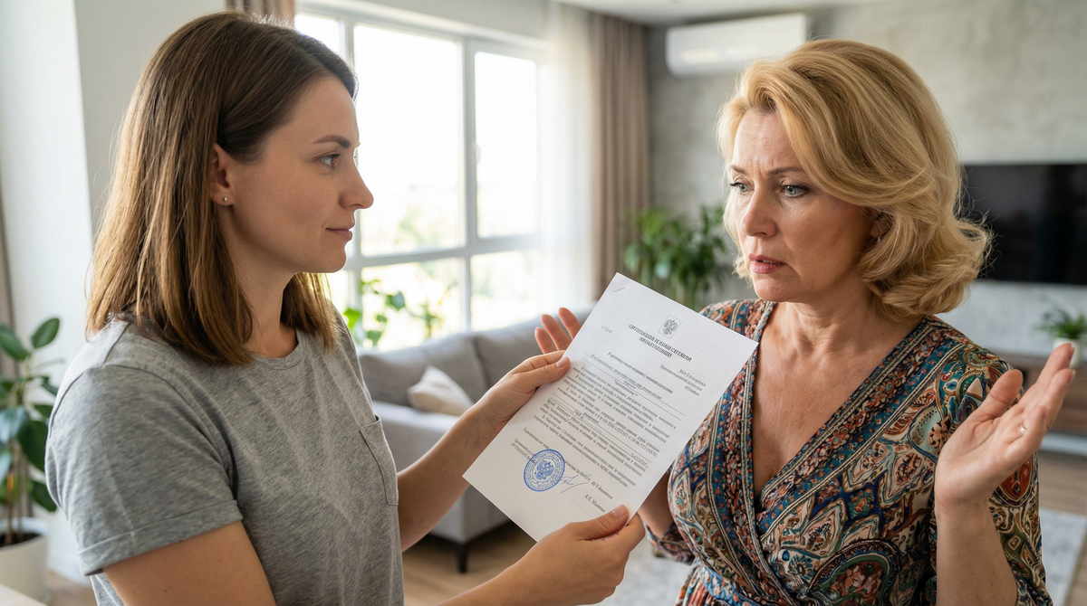 Свекровь перевела взгляд с бумаги на сына, потом на невестку, потом снова на бумагу.