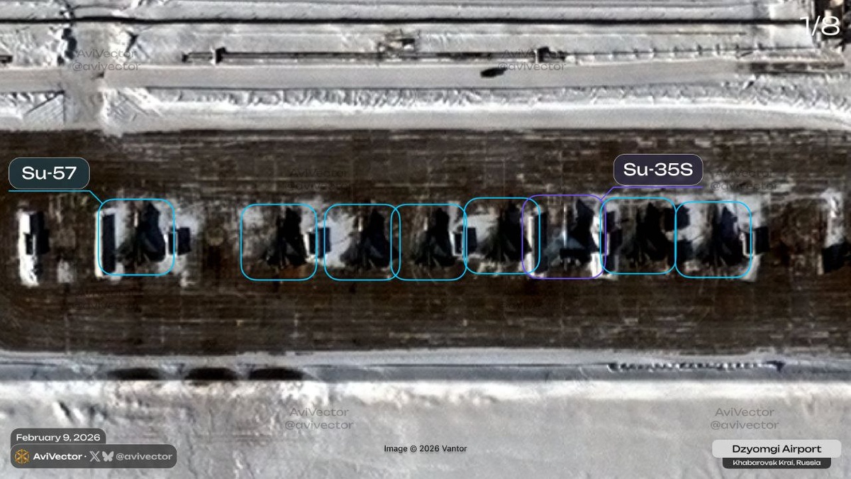 Сразу 15 Су-57, 18 Су-35С, и 3 МиГ-31БМ были сняты спутником на аэродроме Дземги в Комсомольске-на-Амуре. Кроме того, в кадр попали возводимые защитные ангары для самолетов, которые постепенно становятся трендом для многих отечественных авиабаз. Вполне вероятно, на фото находится как минимум часть бортов, недавно переданных и/или подготавливаемых к передаче ВКС России, поскольку сборка Су-35С и Су-57 осуществляется на мощностях авиазавода имени Ю.А. Гагарина, расположенного как раз в Комсомольске-на-Амуре. Военный Осведомитель