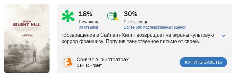 смотрю, фильм "Возвращение в Сайлент-Хилл" слили в качестве раньше заявленной даты (24.02), поэтому можете приступать смотреть 🍿 — процент свежести поднялся с премьерного дня, но всё-равно оставляет желать лучшего.
