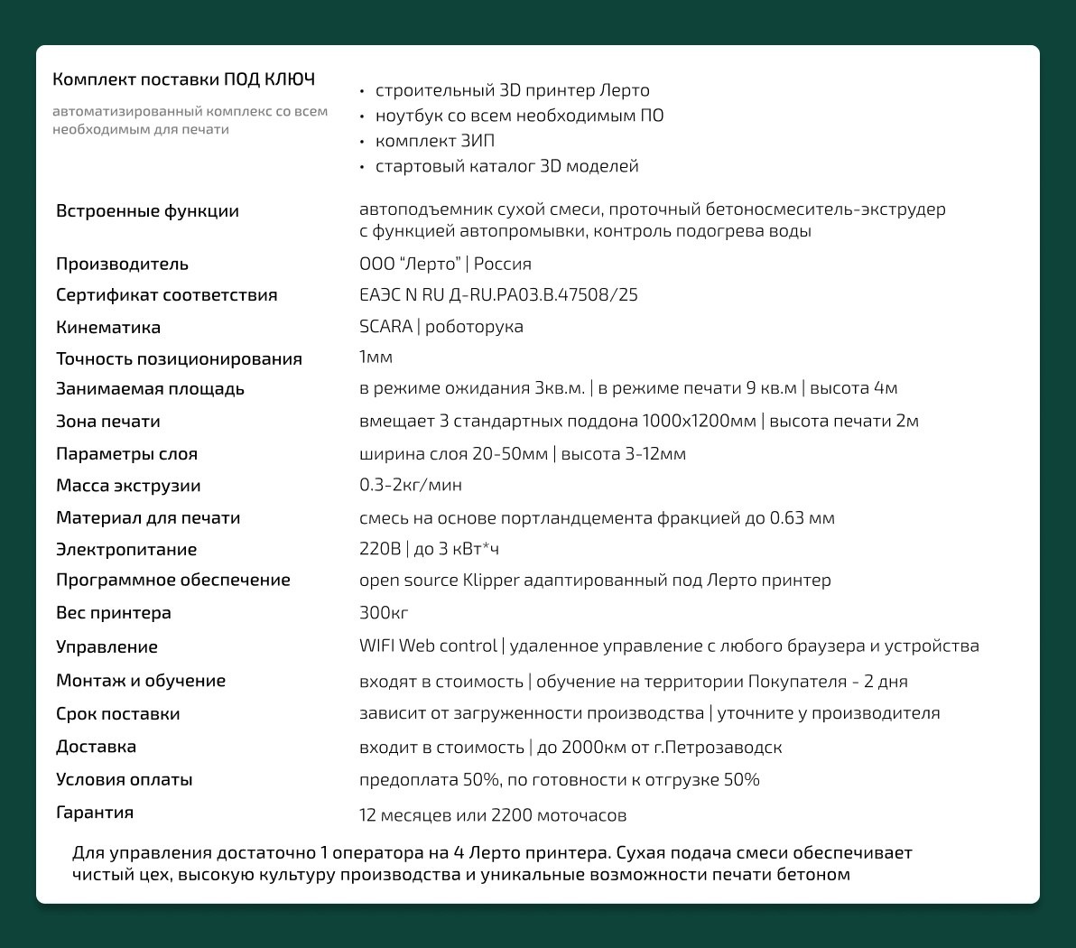 К нам присоединилось много новых подписчиков, которые задают похожие вопросы. Самый главный, что входит в стоимость комплекта поставки и какие характеристики у оборудования. Ответ в прикрепленном к посту изображении. Также всё это указано в коммерческом предложении. Получив его на нашем сайте lerto.ru вы можете узнать не только подробное описание характеристик принтера, но и ознакомиться со стоимостью оборудования. Тогда у вас сложится полноценная картина. Лерто принтер - это высший уровень автоматизации на рынке 3D-печати бетоном. Для работы достаточно 1 оператора на 4 принтера Лерто. Предназначен для использования цеховой печати МАФ, интерьерных решений, фасадного декора и зданий по технологии prefab. Видео подготовки Лерто принтера к печати и непосредственно печать изделий смотрите по ссылке Возможности печати смотрите здесь Напоминание 174: Отсканировав QR-код встроенный в шкаф управления вашего Лерто принтера, вы всегда можете задать вопрос нашему техническому специалисту и