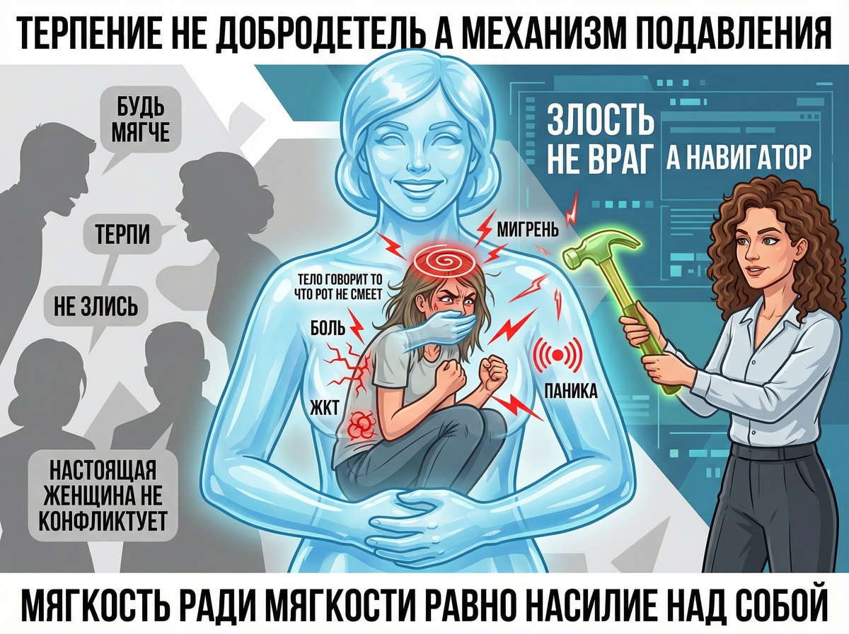 “Будь мягче — и он потянется”. “Мужчину нужно принимать таким, какой он есть”. “Терпение — главное женское качество”. Вы слышали это от мамы, бабушки, подруг, коучей. И послушно терпели. Когда он забыл про годовщину. Когда повысил голос. Когда снова не пришёл вовремя. Вы были мягкой, понимающей, бесконечно терпеливой. И вот результат: он не “потянулся”. Он расслабился. Привык. Решил, что можно ещё больше. А вы сидите с мигренью, бессонницей и чувством, что кто-то украл вашу жизнь. Но вы же “настоящая женщина” — вам не положено злиться. Положено. И сейчас объясню почему. Карен Хорни описала механизм, который работает безотказно: идеализированный образ Я. Это конструкция, созданная в детстве: “Какой я должна быть, чтобы меня любили”. Для девочек этот образ часто звучит так: тихая, уступчивая, заботливая, не конфликтная. Проблема в том, что идеализированный образ — это тюрьма. Вы живёте не свою жизнь, а жизнь персонажа, которого придумали для вас другие. И каждый раз, когда реальная вы (з