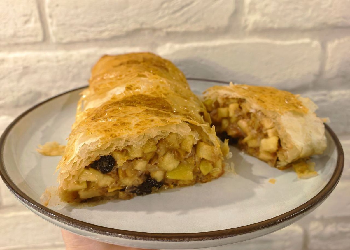 Друзья, приветствую! Пока вся страна печет блины, я продолжаю эксперименты с тестом Фило и сегодня на повестке дня - вкуснейший яблочный штрудель. Его можно было бы сделать совсем легким диетическим, но я выбрала компромисс и приготовила пирог ближе к классике, тем не менее, в нём всего 177 ккал на 100 гр, а вкус просто великолепный! Итак, приготовление до безобразия просто: изюм замачиваем на 15 минут, яблоки режем мелкими кусочками, печенье и орехи мелко рубим (я просто убрала в тонкий полиэтиленовый пакет и побила скалкой). Все смешиваем, добавляем сахарозаменитель и корицу. У меня аллюлоза 50 гр. Можно делать и с сахаром, но калорийность станет выше - около 220 ккал. Далее достаем 6-7 листов теста, кладем их внахлест друг на друга с небольшим отступом и смазываем сверху растопленным сливочным маслом. Выкладываем с одной стороны начинку. Заворачиваем края и скручиваем все в рулет. Рулет смазываем взбитым яйцом. И ставим все выпекать минут на 30 на 180 градусов. Даем немного остыть