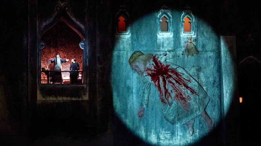 Кстати, про размах. «Годунова» поставил тандем из Болгарии, который подарил публике в прошлом году красочного, безумно красивого вердиевского «Эрнани». В этот раз режиссер Орлин Анастасов и сценограф Денис Иванов, отвечающий сразу за декорации, костюмы и свет, превзошли свой прошлый успех. Анастасову «Борис Годунов» чрезвычайно близок: постановщик, будучи еще и знаменитым басом, выходил в титульной партии в спектаклях Мариинского театра, созданных Андреем Тарковским и Андреем Кончаловским. Режиссер не акцентирует внимание на внешней интриге, в центре его интереса — сам Борис, его больная душа и ее взаимодействие с прошлым и несостоявшимся будущим. Речь идет о убиенном царевиче Димитрии и даже шире: уже в сцене венчания на царство окаянного Годунова окружают пресловутые «мальчики кровавые». Впрочем, собственно окровавлен лишь сам Димитрий (пластическая роль Владислава Урюпичева): царевич дается и в огромной видеопроекции, и вживую (ну как бы), когда в кульминационные моменты занимает царский престол или с отрешенным видом восседает на конике-качалке. Так что никуда не ускакали деревянные лошадки — вот они, бессловесные муки совести, оборачивающиеся страшным криком, на который иногда переходит Ильдар Абдразаков — Годунов: «Что ж не смеешься? А?» — момент, когда царь в исступлении треплет Шуйского, — один из самых пронзительных. Если добавить, что и сам престол помещен на Лобном месте, то действительно — как не сойти с ума и не изойтись надрывными речами.