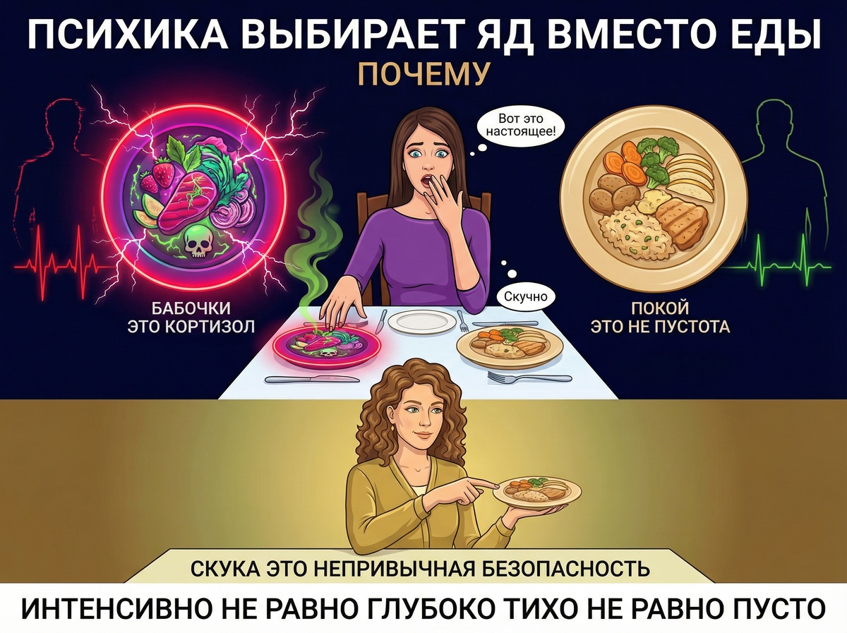 Вот он: звонит, когда обещал. Интересуется вашим днём без подвоха. Не исчезает на трое суток. Не играет в “угадай моё настроение”. Говорит прямо, без двойных посланий. И вы думаете: “Господи, какая тоска”. А потом — через два свидания с этим “прекрасным, но скучным” — вы отвечаете на сообщение того самого, кто не писал неделю. И сердце колотится. И вот это — “настоящее”. Поздравляю: ваша психика только что выбрала отравление вместо еды. Причём осознанно. Вопрос — почему? Фрейд описал принцип, который объясняет половину неудачных романов: навязчивое повторение. Психика стремится воспроизводить ранний опыт — даже болезненный, — потому что знакомое ощущается как безопасное. Но вот парадокс: хороший мужчина не вызывает узнавания. Он не активирует привычные нейронные цепи. С ним нет той электризующей тревоги, которую вы десятилетиями принимали за “химию”. Рядом с ним вашей психике нечего делать. Не нужно расшифровывать, угадывать, спасать, ждать. И этот покой воспринимается как пустота. Не
