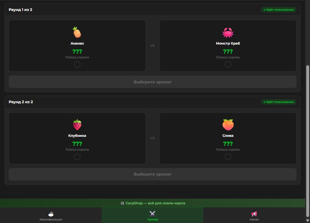 Стартуем! Из-за сбоев работы Telegram пришлось подшаманить нашего бота. Полуфинал начался, можно голосовать! За выход в финал сразятся: 1 пара - 🍍 Ананас х Монстр Краб 🦀 2 пара - 🍓 Клубника х Слива 🍑 ✔️ Бот для голосования - @carptodayappbot Просто переходим в бота и нажимаем кнопку голосовать. 🏁 Финиш полуфинала состоится в пятницу 12:00 по Мск. После него стартует финал. #Carptoday