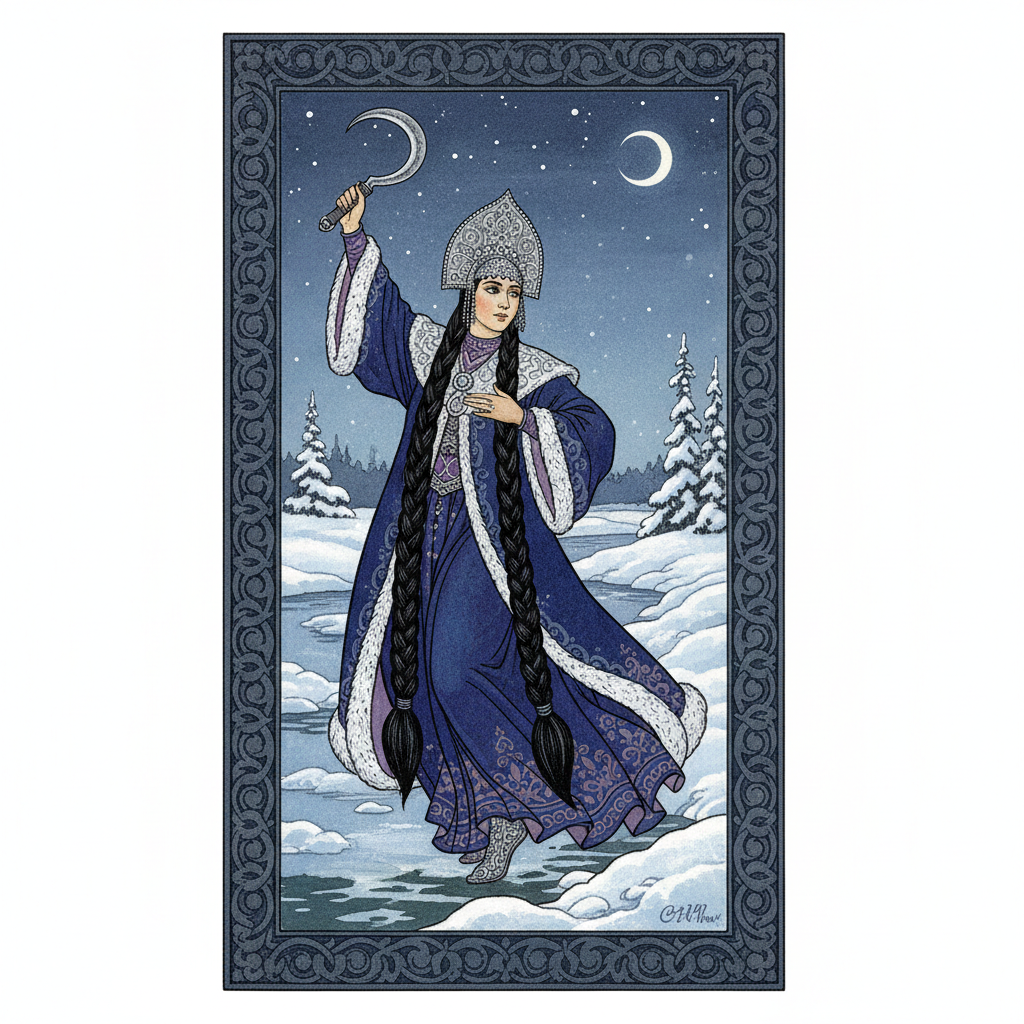 Долго стояла Василиса да на уснувший мир смотрела. Моргнула девица, да вдруг и увидела, как танцует на реке прекрасная дева в богатых одеждах. Повернулась дева, увидела Василису да и к ней пошла. А как подошла ближе дева узнала Василиса в деве Мару-Морену, Богиню зимы да владычицу Навьего царства.