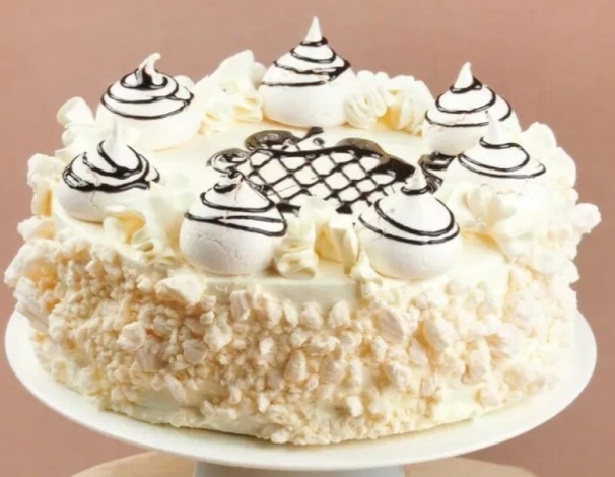 5. Декор: обсыпьте бока крошкой безе, украсьте верх кремом и фигурками безе .