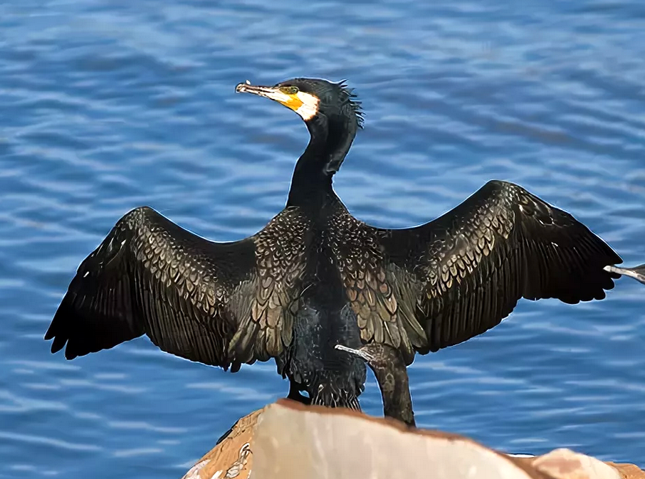 Отдых и сушка оперения: Одной из самых характерных поз большого баклана является поза "сушки". После ныряния их оперение, в отличие от многих других водоплавающих птиц, не является полностью водонепроницаемым. Это позволяет им легче погружаться и оставаться под водой, но требует регулярной сушки. Бакланы часто сидят на камнях, ветках деревьев, буях или других возвышениях, широко расправив крылья, чтобы просушить перья на солнце и ветру. Это зрелище стало визитной карточкой вида.