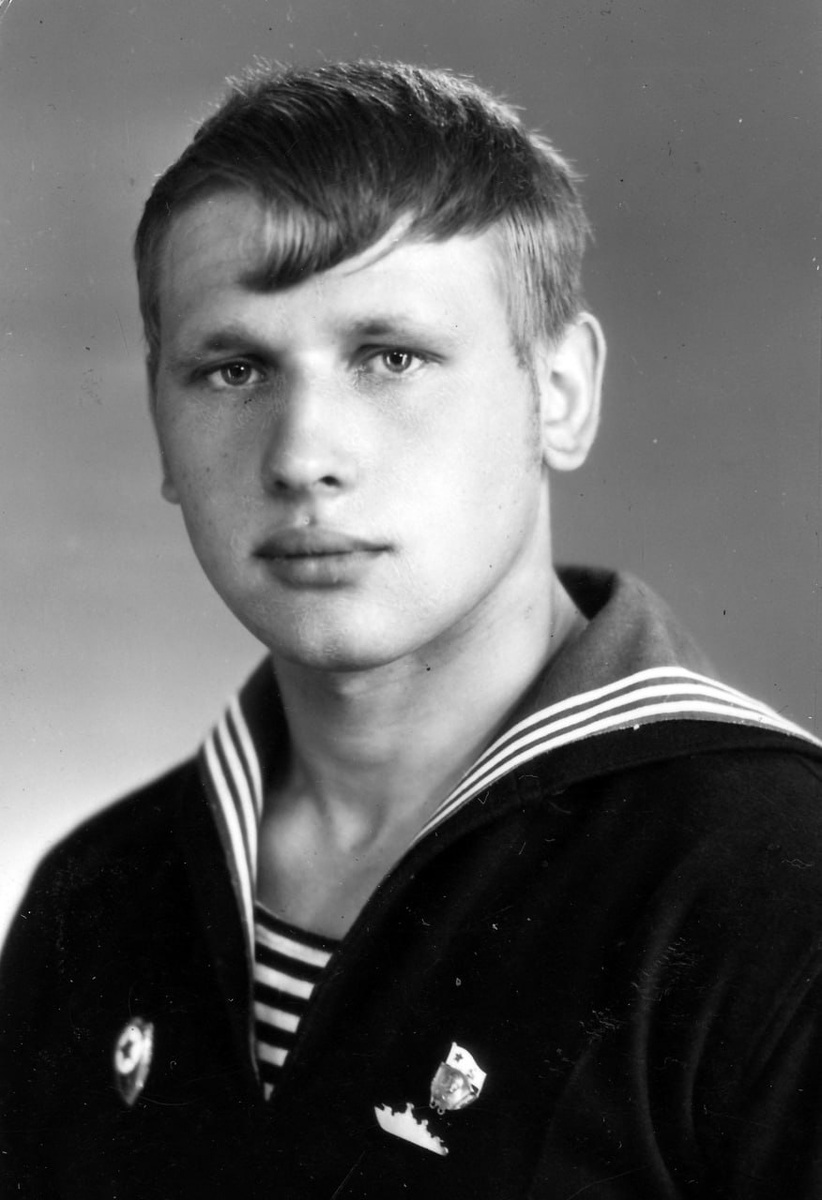 На груди знак "Отличник ВМФ" и самодельный знак ВЛКСМ с подвеской в виде корабля.