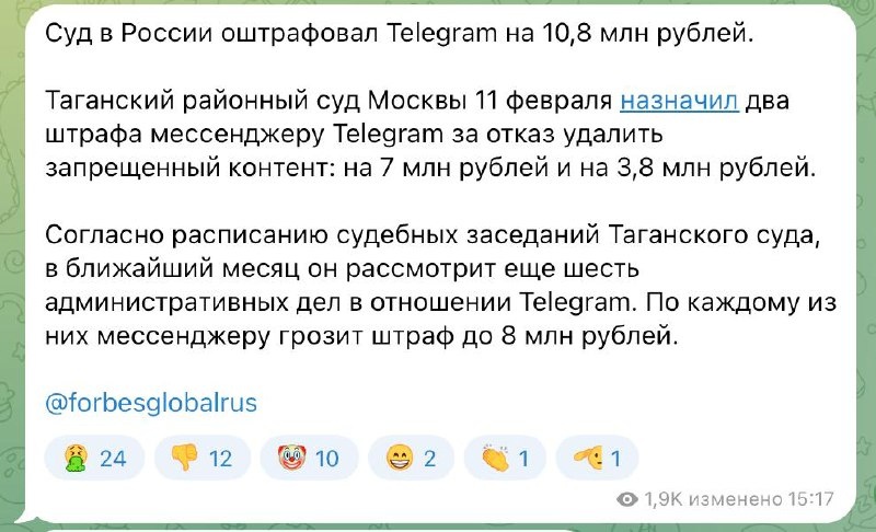 ⚡️⚡️⚡️⚡️ Ну все началось! Суд в России оштрафовал Telegram на 10,8 млн рублей
