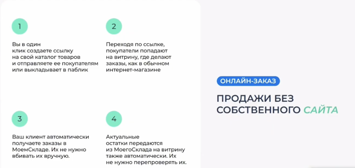 Онлайн-заказ — инструмент внутри МойСклада — решает эту проблему иначе. Не полноценный интернет-магазин, а каталог по ссылке: отправил покупателю, он выбрал товары, заказ автоматически попал к вам. Более 2 000 компаний используют его прямо сейчас, и каждый месяц через него проходит больше 150 000 заказов.
