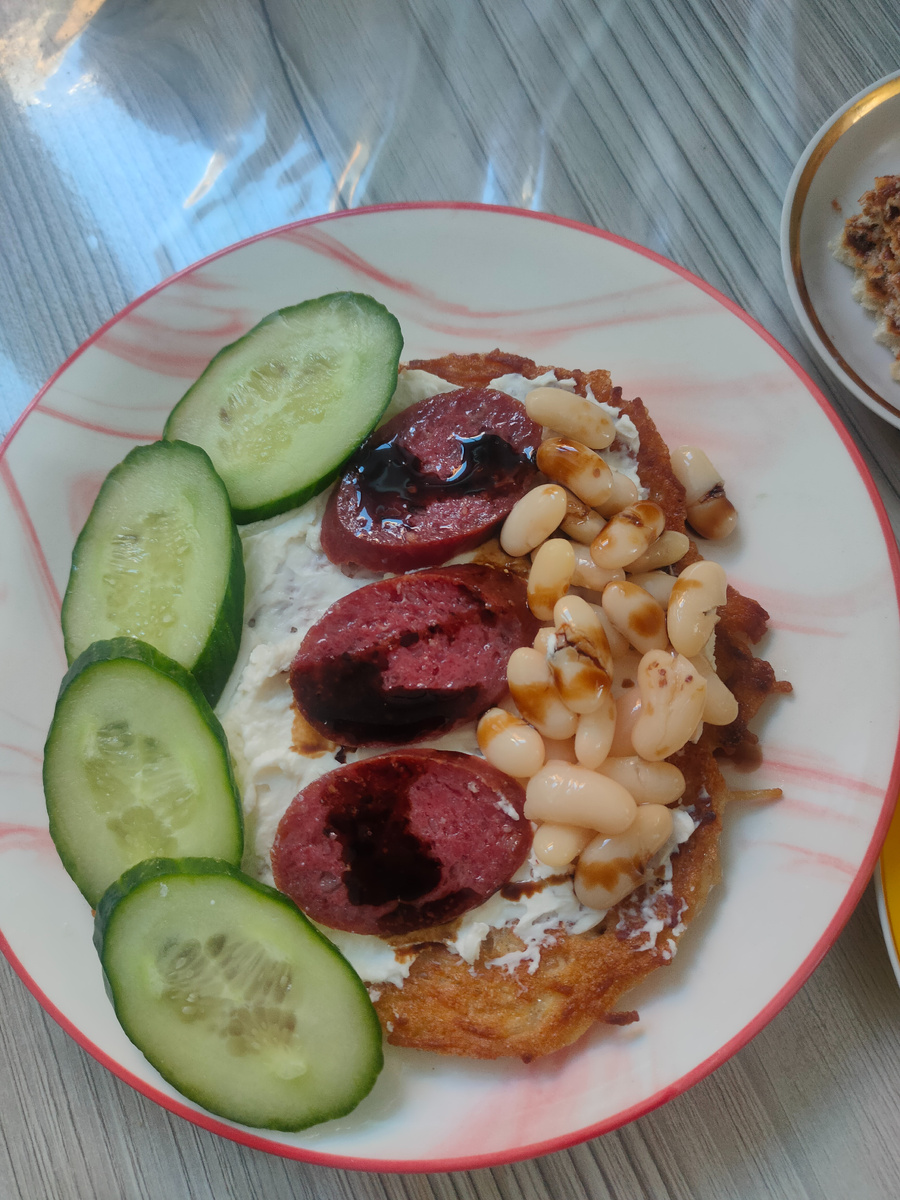 Всем привет! С вами Надежда и сегодня я хочу предложить вашему вниманию идею моего меню, которое не отнимет у вас много времени на приготовление. Вот уже и середина недели пролетела. Опять у нас был снег. После завтрака пойду его убирать. Сегодня в планах у меня уборка в доме и небольшая стирка. А пока готовлю завтрак. В холодильнике уже несколько дней в нулевке скучает вареная вермишель. Вот из нее сегодня и буду готовить завтрак. Ее у меня немного, как раз хватит на небольшой блин, остается в нее разбить одно яйцо, тщательно размешать, чуть подсолить и на сковороду, разравнять ее тонким слоем и поджарить с двух сторон до румяной корочки. Для начинки подойдет все. что есть в холодильнике. Я намазала его остатками сливочного сыра для салата, порезала немного колбаски, свежего огурца и вареной белой фасоли. Вкусный и сытный завтрак готов. Полила бальзамическим крем - соусом для красоты, но не получилось, на горячей колбаске растекся. А также заварила черный кофе. С кофе доела последний