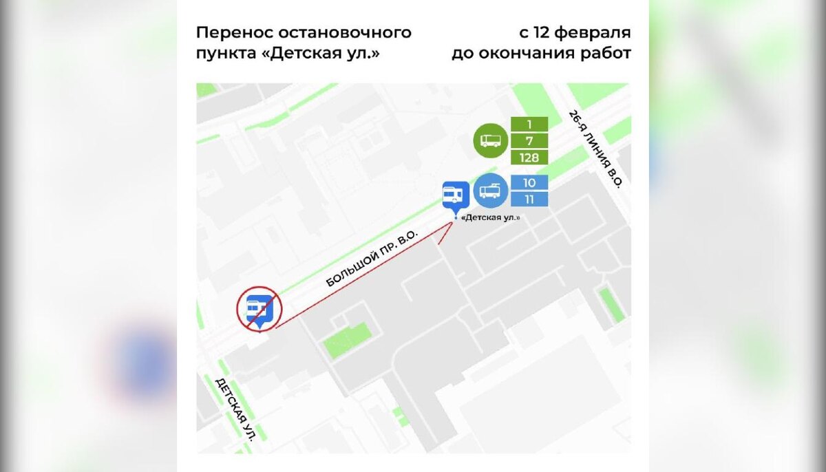 С 12 февраля в Василеостровском районе Санкт-Петербурга временно изменится схема движения общественного транспорта. В связи с проведением дорожных работ на Большом проспекте Васильевского острова переносится остановочный пункт. Остановка «Детская улица», расположенная у дома 88 по Большому проспекту В. О. в направлении от Наличной улицы, будет временно смещена к дому 78 по той же магистрали. Изменения затронут автобусные маршруты № 1, 7, 128, а также троллейбусные маршруты № 10 и 11. Остановка будет работать на новом месте до окончания всех ремонтных работ. Горожан просят учитывать изменения при планировании поездок. Ранее сообщалось, что дорожные работы ограничат движение по ЗСД с 10 по 12 февраля.