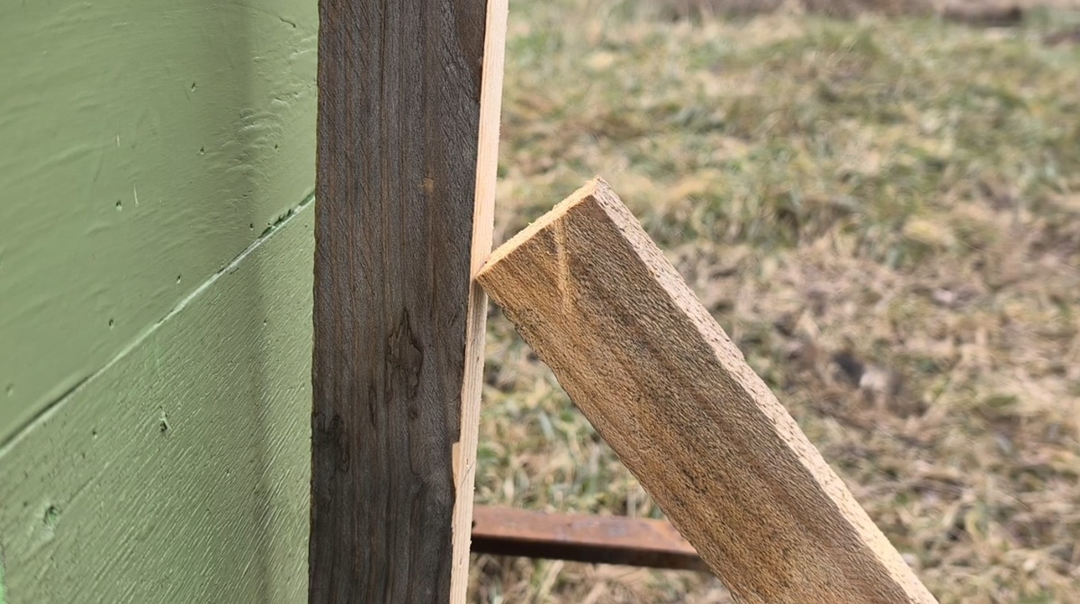 Покажу на примере, как можно легко разметить, сделать ровный запил стропила и добавить опору. Способ нестандартный, поэтому ни в коем случае не призываю делать так, как описано в статье. Для начала немного смещаем стропило у края стойки, прикладываем уровень или ровную рейку к стропилу, прижав её к стойке, как показано на фото ниже. Чертим карандашом ровную линию, обозначая место будущего реза. Теперь нужно отрезать лишнее. На коленках при помощи ножовки или лобзика получится неровно, поэтому рекомендую делать это на отрезном станке или, в крайнем случае, использовать стусло. Кстати в моём Телеграм канале часто проходят розыгрыши инструментов, поэтому приглашаю подписаться 👉 https://t.me/samodelkin123 Отрезанный кусочек не выбрасываем — он пригодится и будет выполнять немаловажную роль в фиксации стропила. Прикладываем стропило к стойке и снизу подставляем оставшийся кусочек; после чего саморезами фиксируем его в нескольких местах — в бок и наискось. Саморезы лучше взять усиленные, та