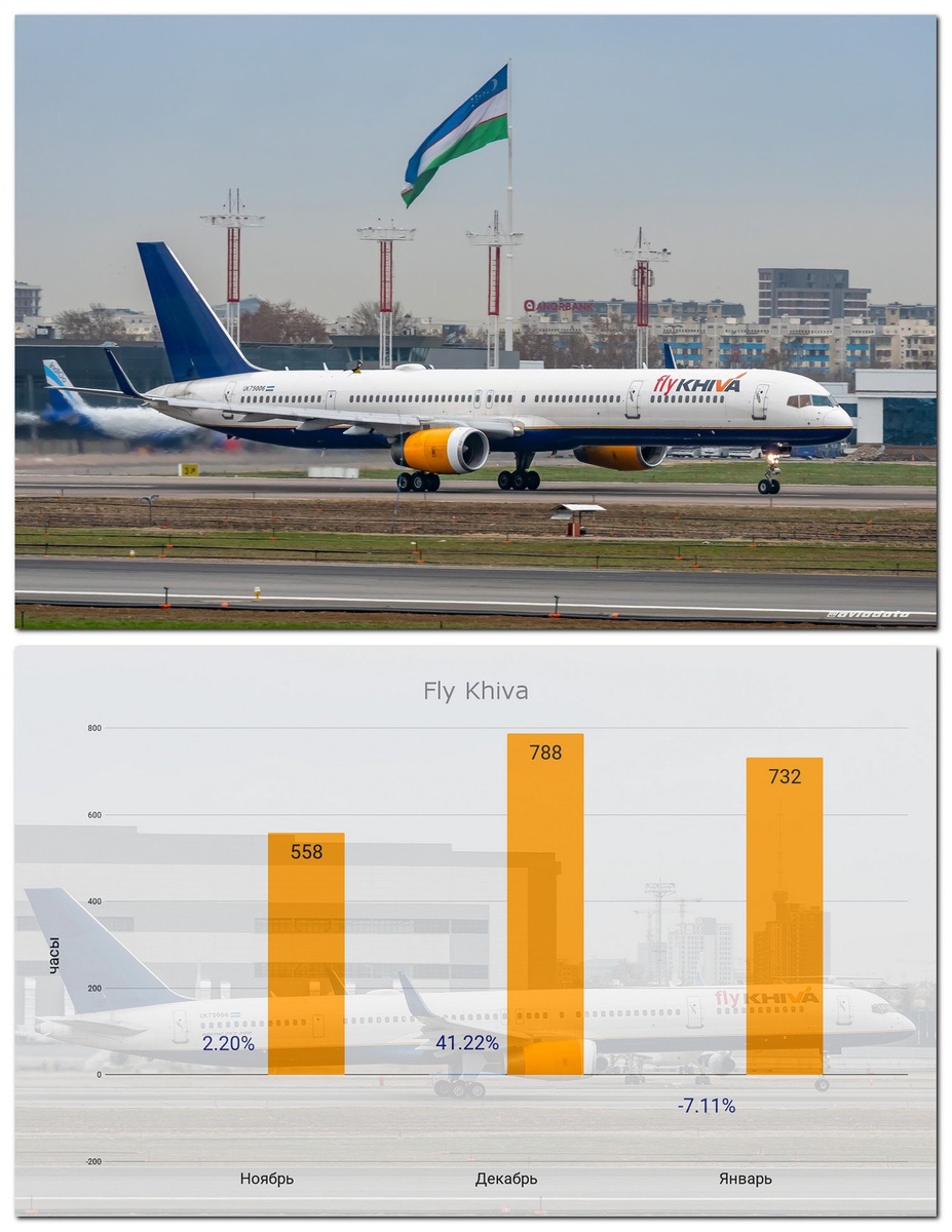 В январе Boeing 757-300 UK75006 начал проходить техническое обслуживание, поэтому общий налёт немного уменьшился. На это время помогает выполнять рейсы на условиях мокрого лизинга - Boeing 737-800 LY-SEI авиакомпании GetJet Airlines. Среднесуточный налёт на одно воздушное судно уменьшился ⬇️ на 7.09% и составил 7.52 часа. Суммарное количество часов налёта воздушных судов авиакомпании Fly Khiva (включая грузовой) за январь уменьшилось 🔽 на 7.11% по сравнению с декабрём и составило 732 часа. Общая динамика за последние 3 месяца представлена на графике. #статистика #flykhiva #январь2026
