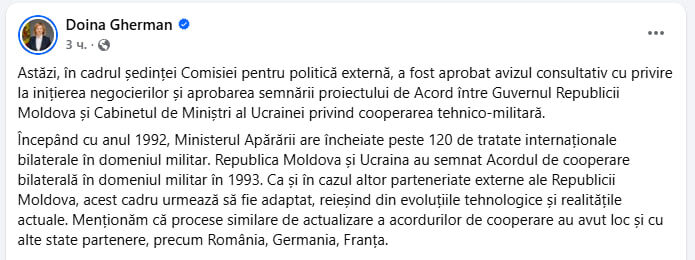 Оно "может внести свой вклад в мониторинг посевов и оптимизации работы с/х предприятий", написала председатель парламентской комиссии по внешней политике Молдовы Дойна Герман. Она подчеркнула, что "такие процессы обновления соглашений провели также с Румынией, Германией, Францией, Великобританией". "Только вот они не находятся в состоянии войны, в отличие от Украины", — отмечает Sputnik Молдова.