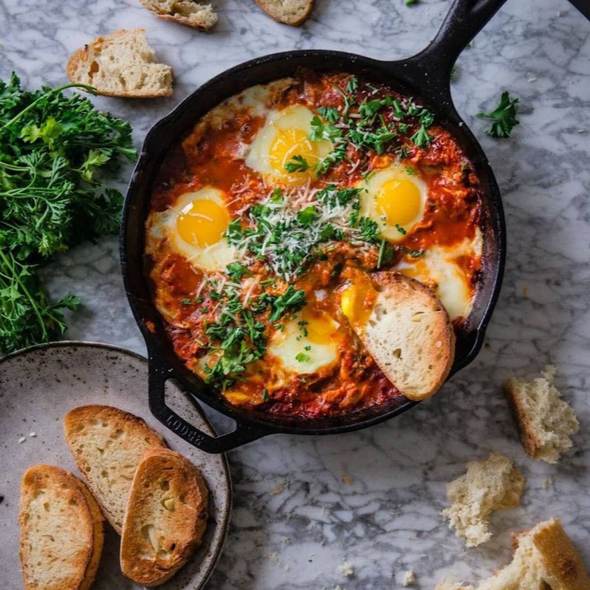 В странах восточного Средиземноморья яйца часто соединяют с бобовыми – фасолью или нутом. Яйца разбивают в горячую основу из томатов, лука, специй и нута и доводят до нужной степени мягкости. Яйца, бобовые и овощи в одной сковороде — идеальный средиземноморский дуэт для вечера.