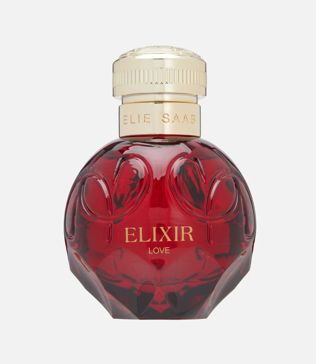 Объект: В центре кадра, на матовом рубиновом подиуме, неподвижно стоит флакон парфюма “ELIE SAAB Elixir Love”. Он — эпицентр всего действия, якорь сцены.