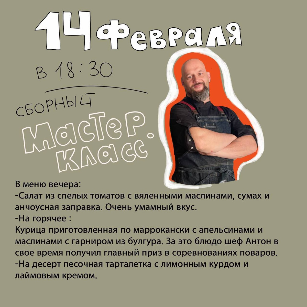 ! 14 февраля в 18:30 пройдет практический мастер-класс!!! Готовим салат и горячее с шефом,десерт Антон приготовит при вас💛 В меню вечера: Салат из спелых томатов с вяленными маслинами, сумах и анчоусная заправка. Очень умамный вкус. На горячее : Курица приготовленная по маррокански с апельсинами и маслинами с гарниром из булгура. За это блюдо шеф Антон в свое время получил главный приз в соревнованиях поваров. На десерт песочная тарталетка с лимонным курдом и лаймовым кремом. Продолжительность 3,5 часа Стоимость 5500₽ с человека Б/а напитки входят в стоимость(лимонад,чай,кофе на песке) Спиртное можно принести с собой А еще поиграем в крокодил и посмотрим фокусы. До встречи! Запись и оплата 89275596440 Надежда