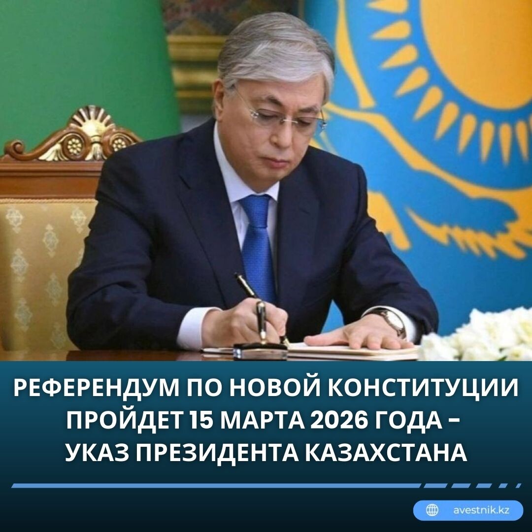 В соответствии с подпунктом 10) статьи 44 Конституции Республики Казахстан и статьей 18 Конституционного закона Республики Казахстан «О республиканском референдуме» ПОСТАНОВЛЯЮ: 1️⃣ Провести 15 марта 2026 года республиканский референдум. 2️⃣ Вынести на республиканский референдум проект новой Конституции Республики Казахстан со следующей формулировкой вопроса: «Принимаете ли Вы новую Конституцию Республики Казахстан, проект которой опубликован в средствах массовой информации 12 февраля 2026 года?». 3️⃣ Официально опубликовать 12 февраля 2026 года в средствах массовой информации настоящий Указ и проект Конституции Республики Казахстан. 4️⃣ Возложить подготовку и проведение республиканского референдума на Центральную избирательную комиссию Республики Казахстан, выполняющую функции Центральной комиссии референдума, а также на территориальные и участковые избирательные комиссии. 5️⃣ Правительству Республики Казахстан совместно с ЦИК РК, другими центральными государственными и местным
