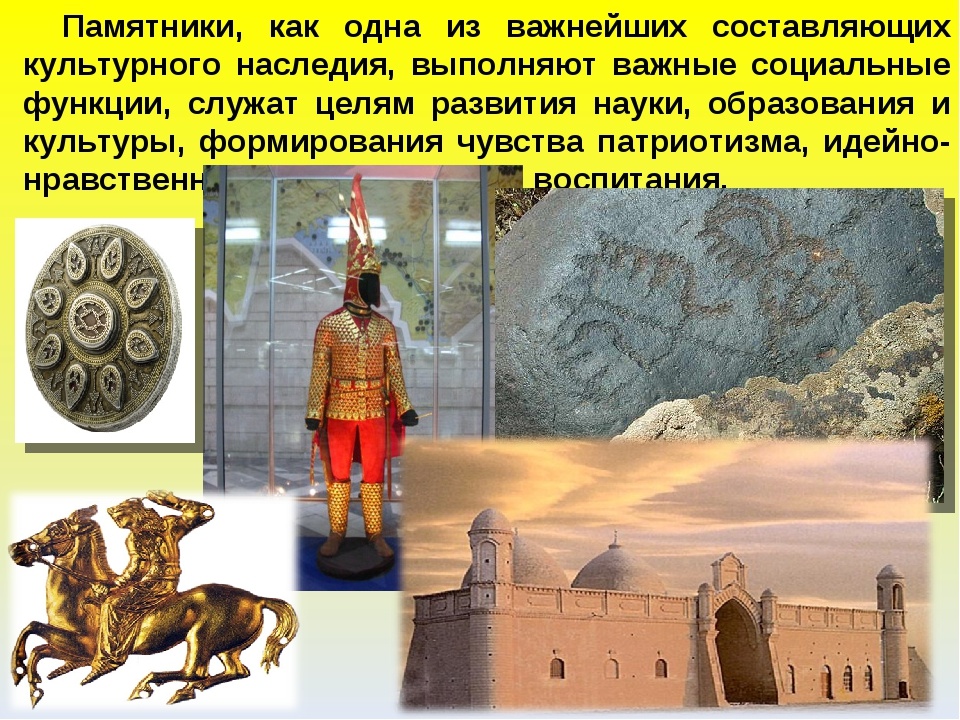 Традиционно считается, что памятник истории и культуры представляет собой материальный объект, хранящий и транслирующий многозначную для общества информацию (от научной до эстетической). Они способны напоминать нам о важности фрагментов общего прошлого. Однако памятник истории и культуры – это также определенный предмет, обладающий статусом охраняемого объекта, поскольку он является частью наследия мира, страны, региона, нации. Руководствуясь таким, скорее официальным, определением мы имеем возможность акцентировать внимание на способах решения целого спектра проблем, связанных с охраной памятников истории и культуры. Отсюда, памятники истории и культуры мира – объекты, имеющие определенную социальную значимость и охраняемые с помощью специальных правовых норм. Причем уровень их охраны (например, международный или национальный) напрямую зависит от того сообщества, которое приняло решение о ценности данного памятника истории и культуры. Также определяя – что такое памятник истории и кул