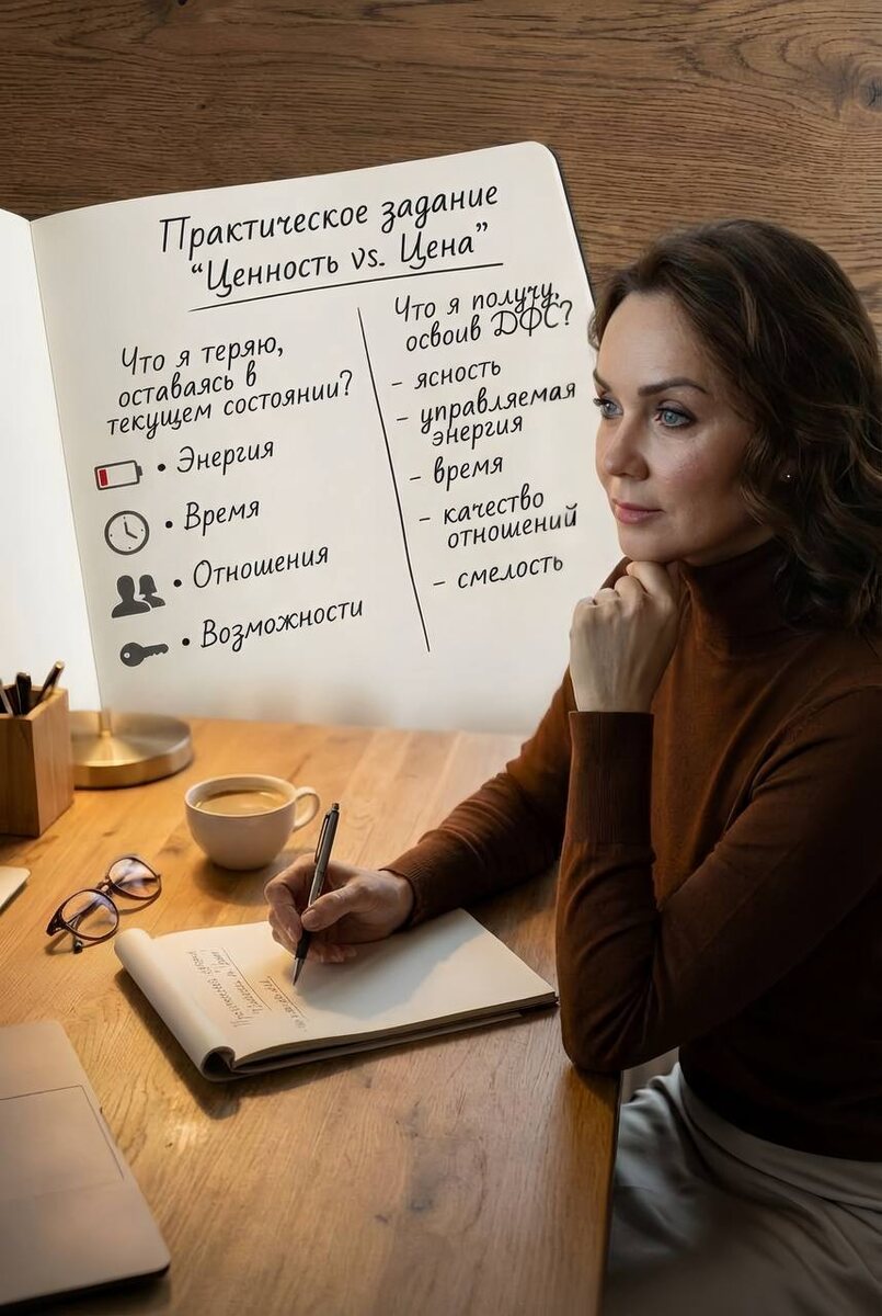 Цена»: Возьмите лист бумаги 📄 Слева напишите: «Что я теряю, оставаясь в текущем состоянии?». И выпишите не только деньги (на компенсации, на лечение последствий стресса), но и неденежные валюты: ✔️Энергия: Сколько сил уходит на беспокойство и прокрастинацию? ✔️ Время: Сколько часов в неделю я трачу неэффективно из-за расфокуса? ✔️ Отношения: Какую цену платят мои близкие за мою раздражительность или отсутствие? ✔️ Возможности: Сколько шансов я упускаю, потому что не решаюсь или не верю в себя? Справа напишите: «Что я получу, освоив ДФС?». Тут — ясность, управляемая энергия, время, сэкономленное на восстановлении, качество отношений, смелость действовать. — Посмотрите на эти два столбца. Где перевес? Часто левая колонка — это тихий, но постоянный финансовый и жизненный слив. Правая — это единовременная инвестиция, которая этот слив перекрывает. И последний, самый важный аргумент.100 000 рублей за курс — это не трата. Это ваше публичное соглашение с самим собой. Это знак, который в
