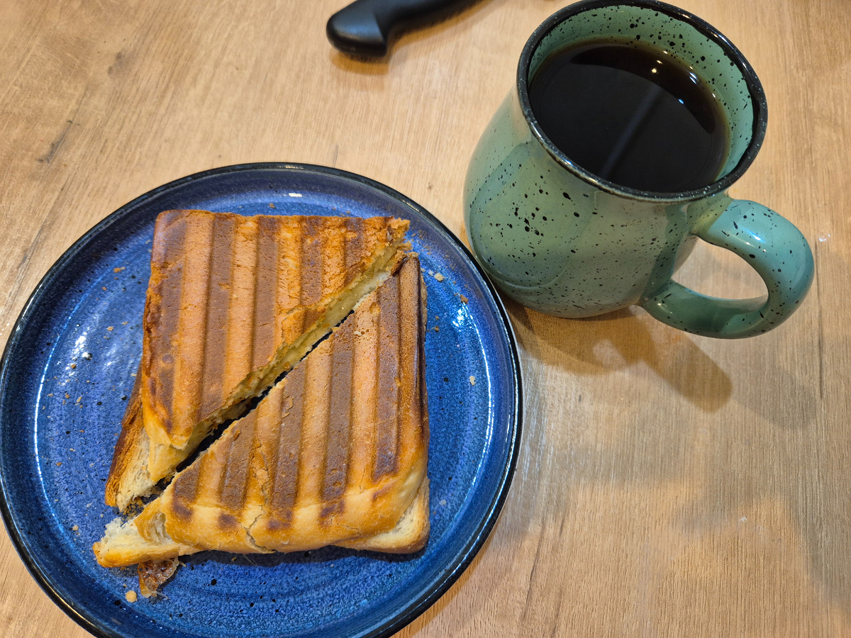 Горячие бутерброды с сулугуни и отварным яйцом, кофе Американо.
