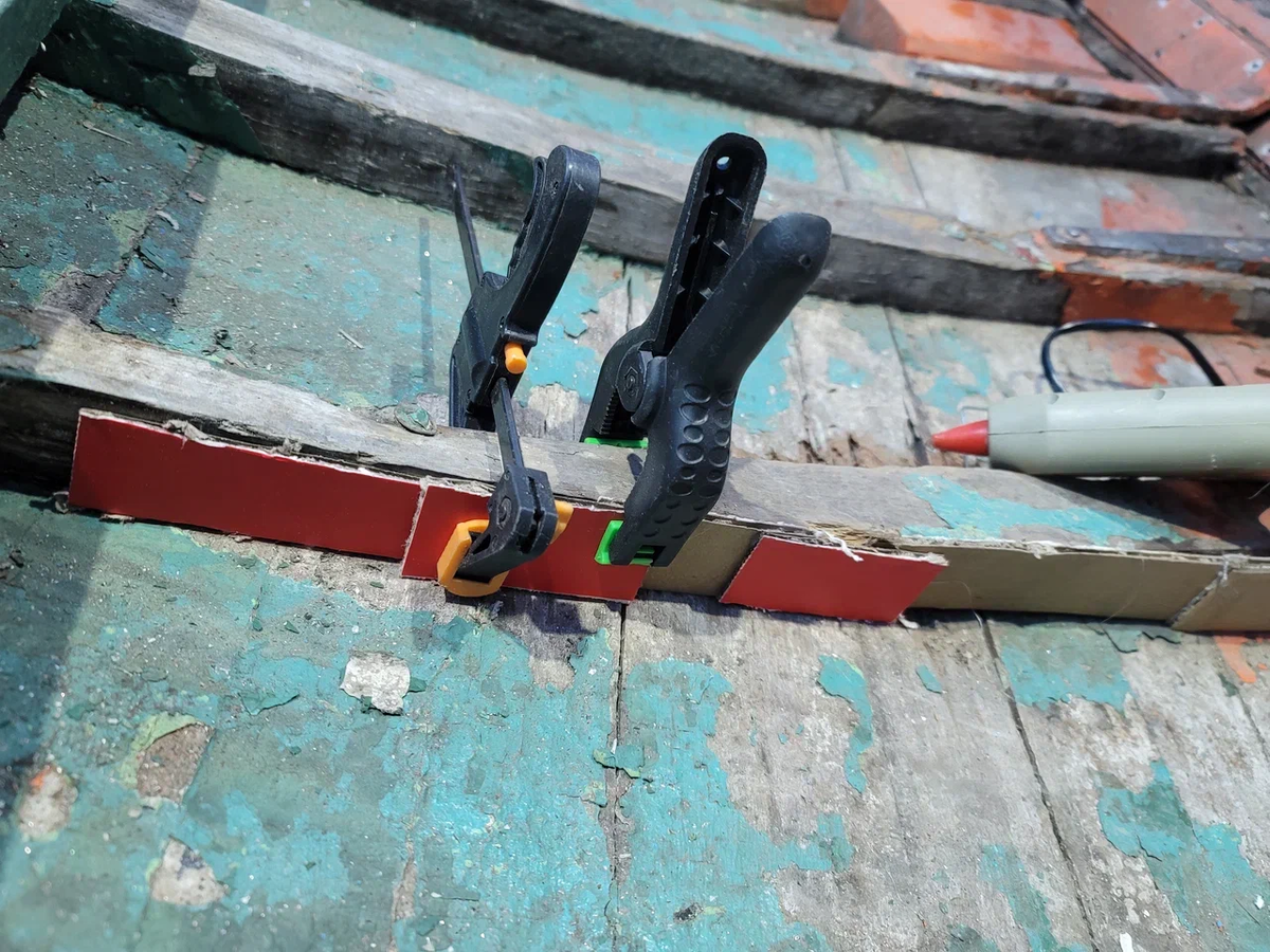 Нарезал лист картона на небольшие прямоугольные фрагменты. Включил пистолет и начал собирать профиль, прикрепляя фрагмент за фрагментом к живому ( но сильно болеющему ) шпангоуту как раз теми самыми модельными струбцинками.